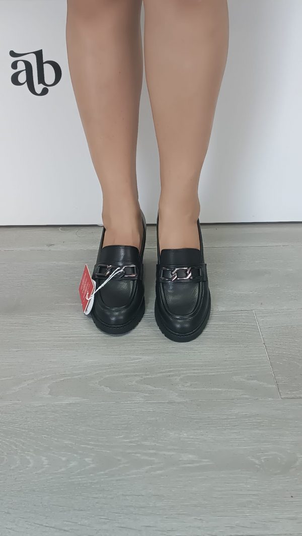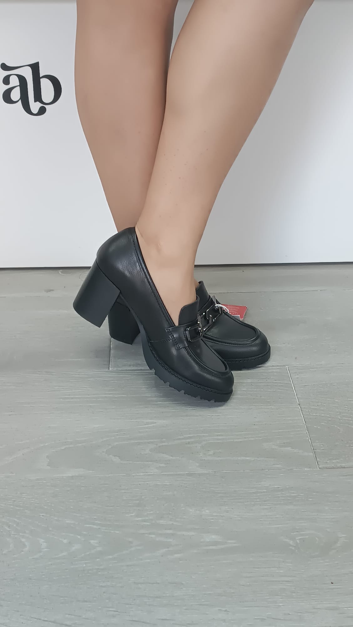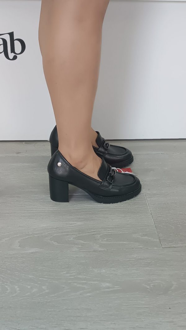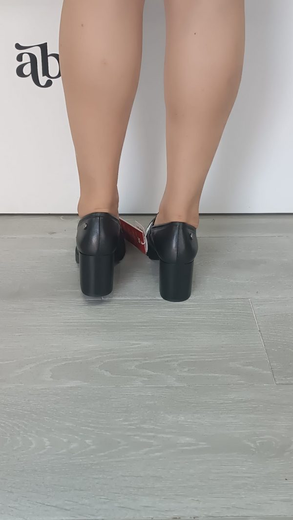 Su tacón ancho de altura media-alta ofrece una pisada estable y favorecedora, perfecta para el día a día o para ocasiones más formales. El color negro aporta versatilidad, permitiéndote combinarlo fácilmente con pantalones, faldas o vestidos.