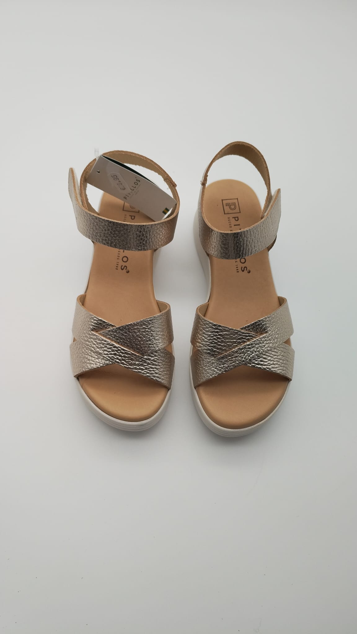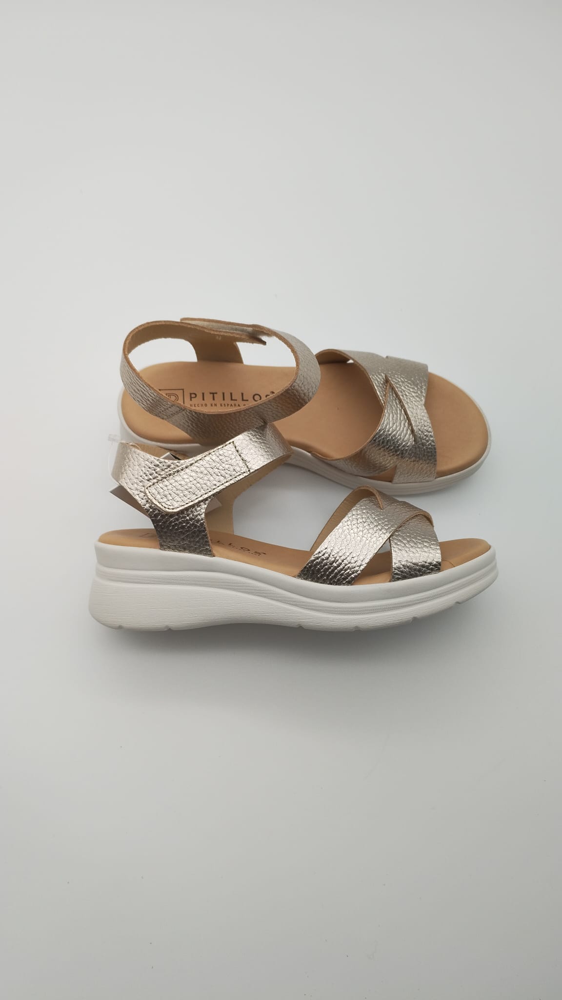 Aporta un toque de elegancia y sofisticación a tus looks con esta sandalia de pala cruzada en piel de Pitillos. Su acabado en color oro es perfecto para iluminar cualquier outfit, desde los más casuales hasta los más especiales.