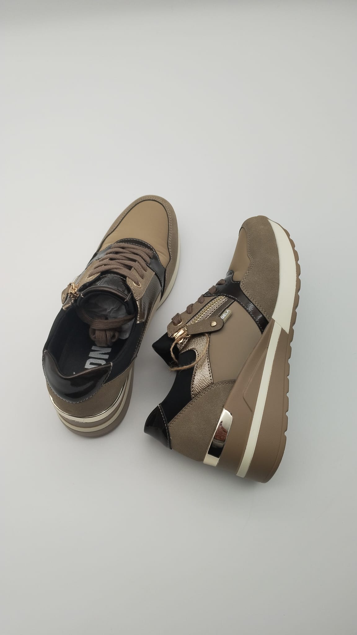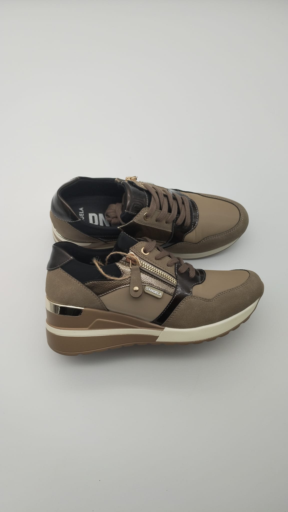 Eleva tu estilo diario con estas zapatillas D’Angela de diseño moderno y elegante. Confeccionadas en una combinación de materiales de alta calidad en tonos beige, taupe y negro, ofrecen un look sofisticado y versátil, perfecto para cualquier ocasión casual o urbana.