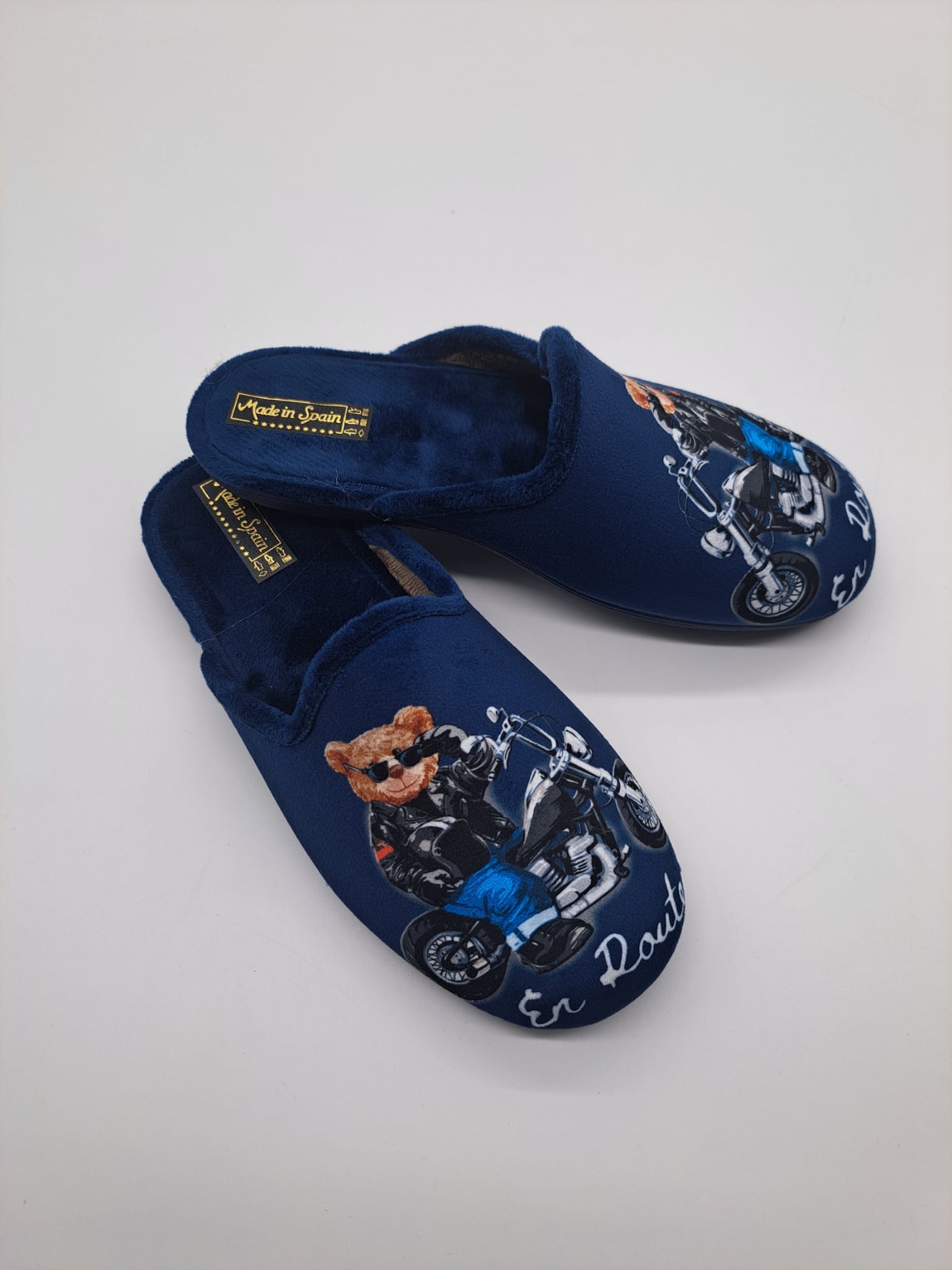 Relájate con estilo con nuestras divertidas zapatillas de casa “Er Rauter”, confeccionadas con materiales suaves y de alta calidad. Su diseño original muestra un simpático oso motero con chaqueta de cuero, jeans y gafas de sol, aportando un toque de humor y personalidad a tus momentos de descanso.
