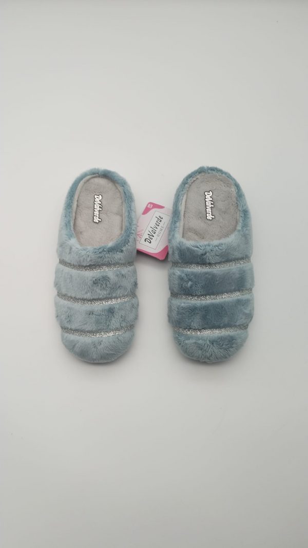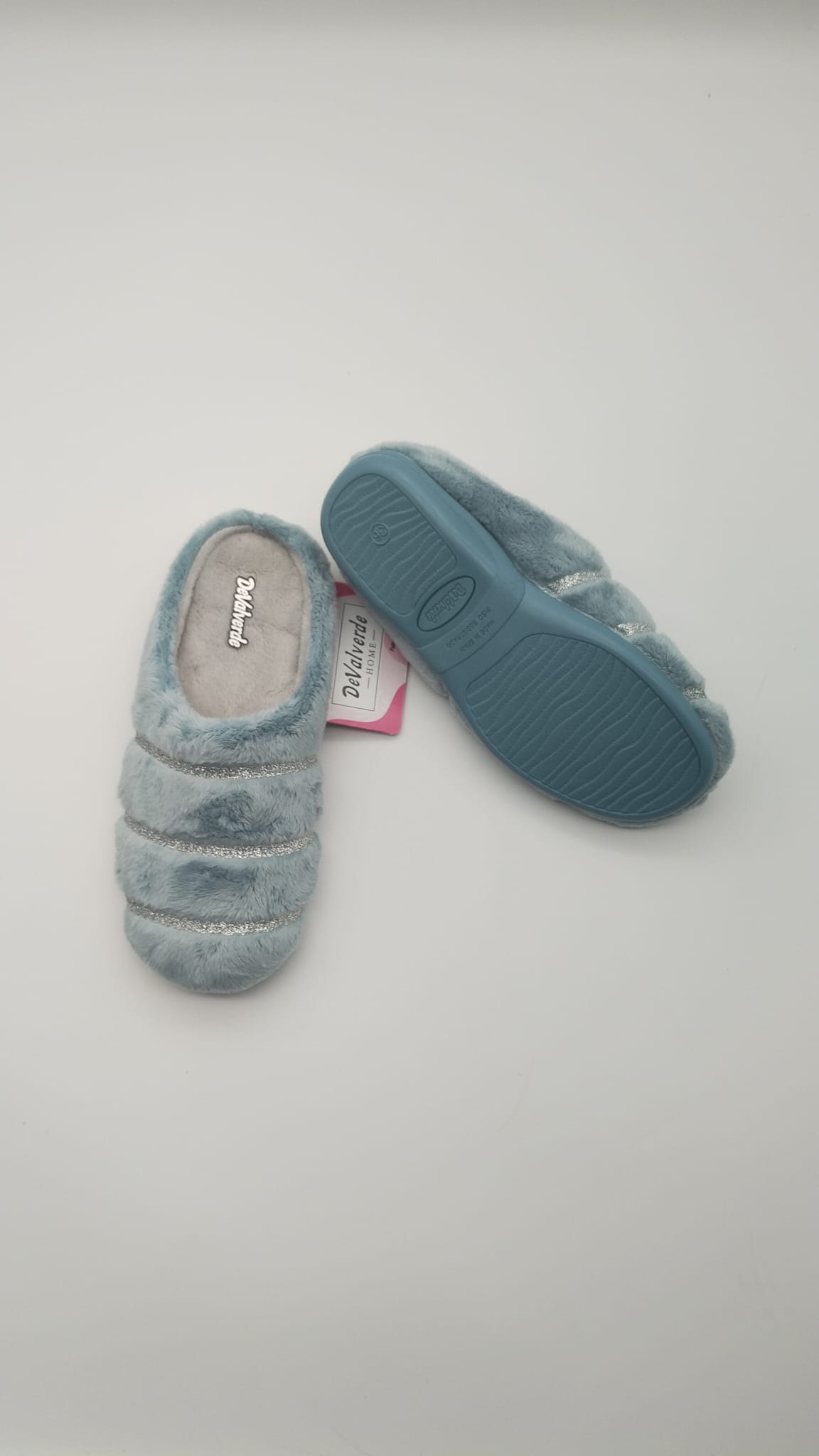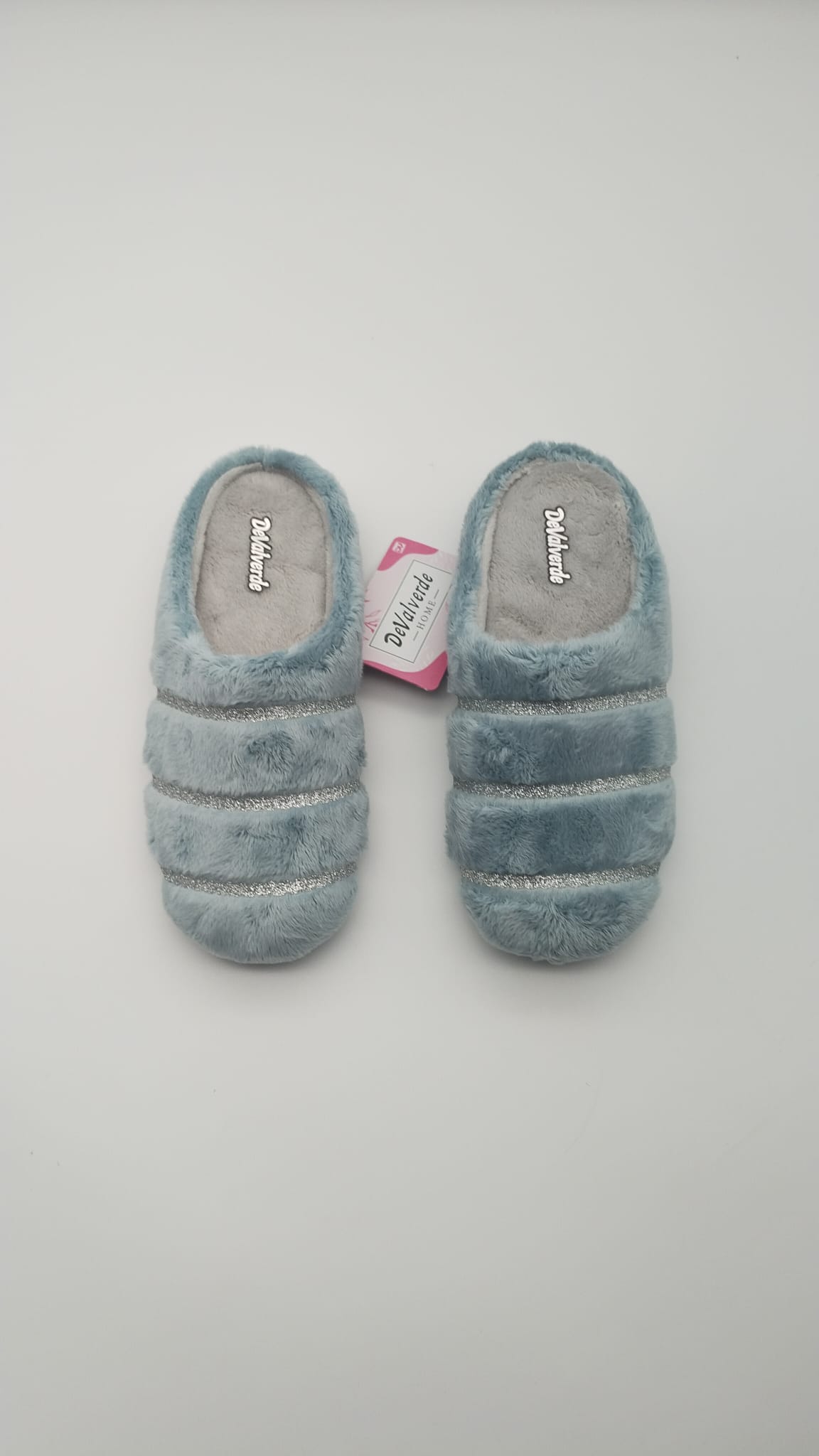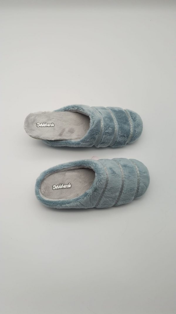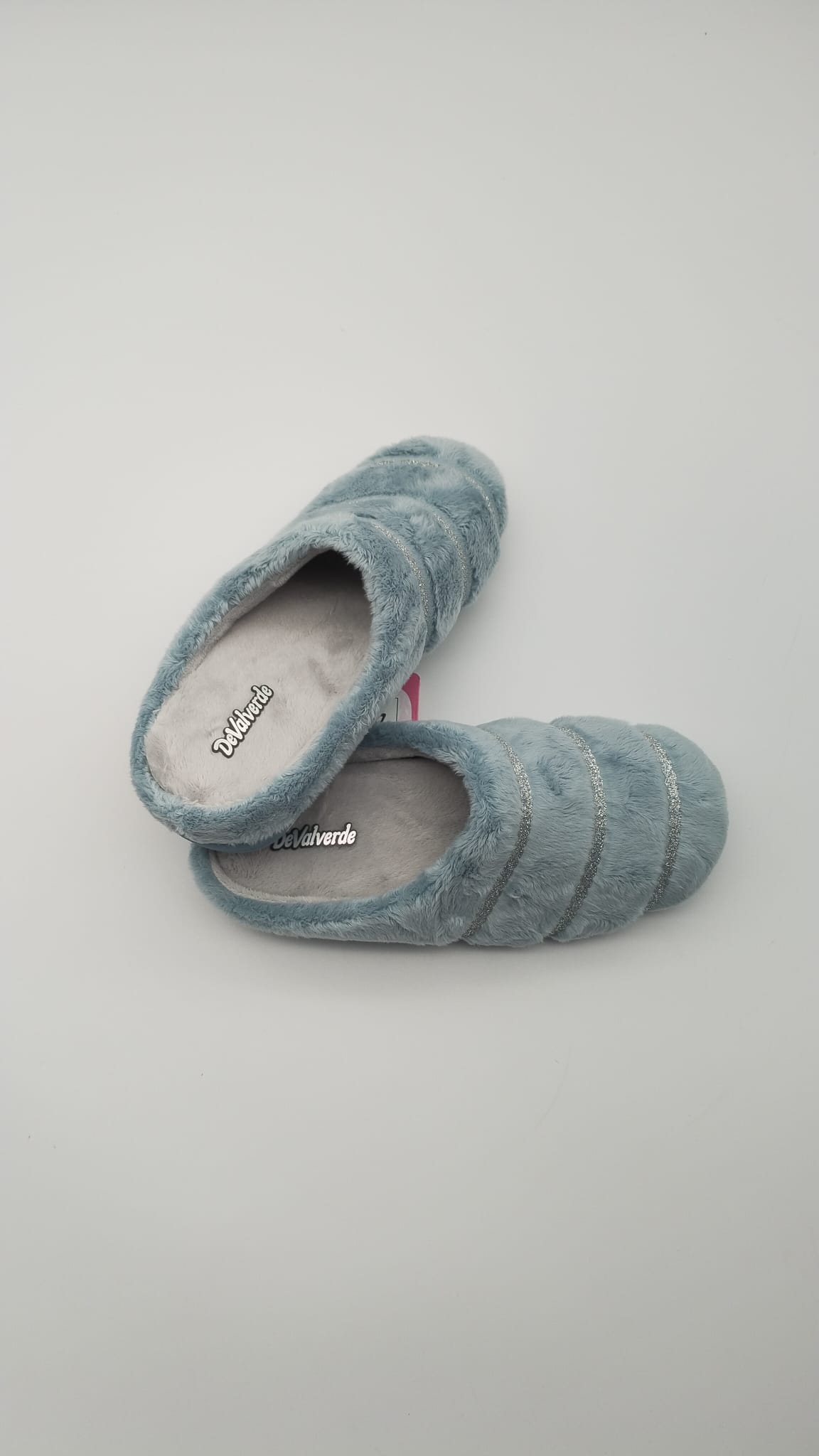 Disfruta de la máxima comodidad en casa con estas pantuflas suaves y elegantes. Están confeccionadas en un material de peluche azul celeste con detalles de líneas plateadas brillantes que aportan un toque moderno y femenino.