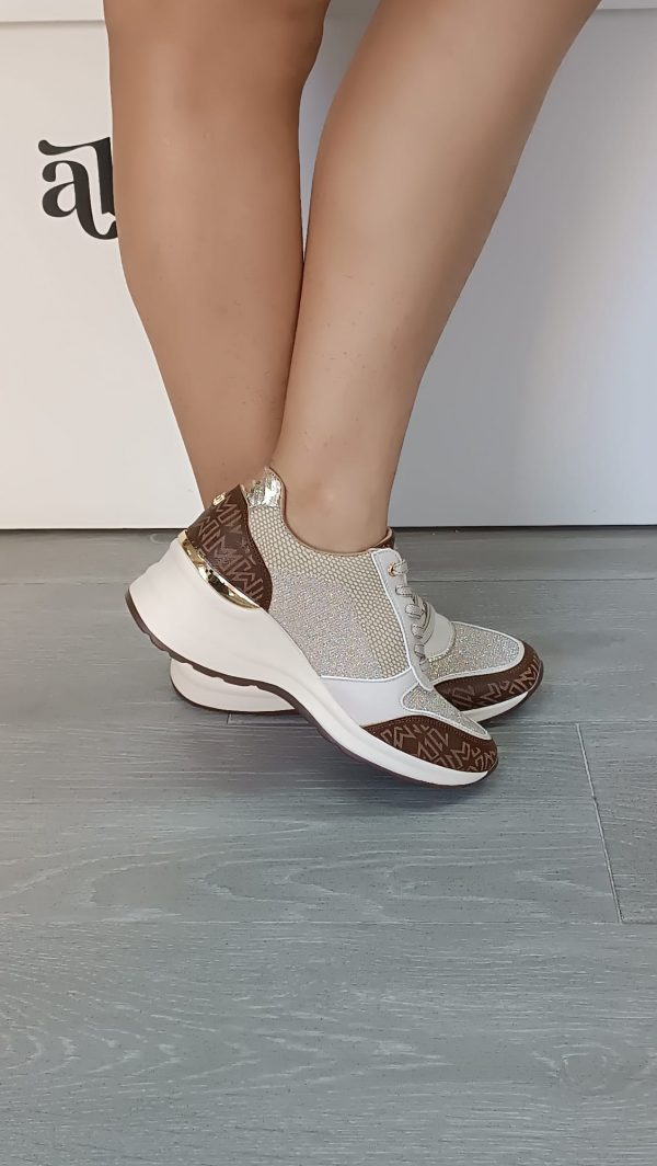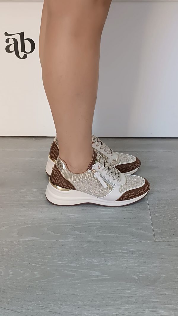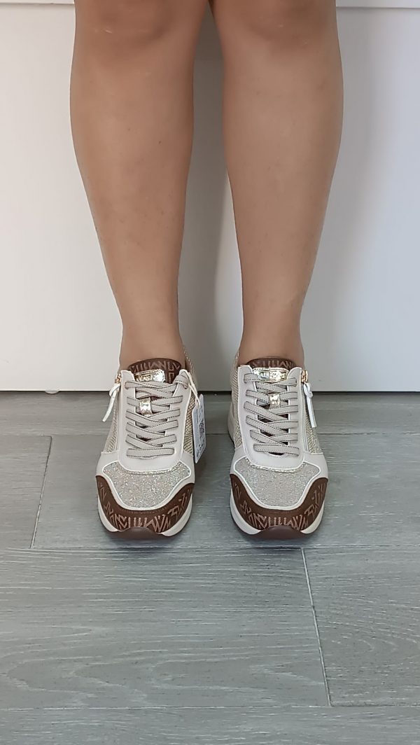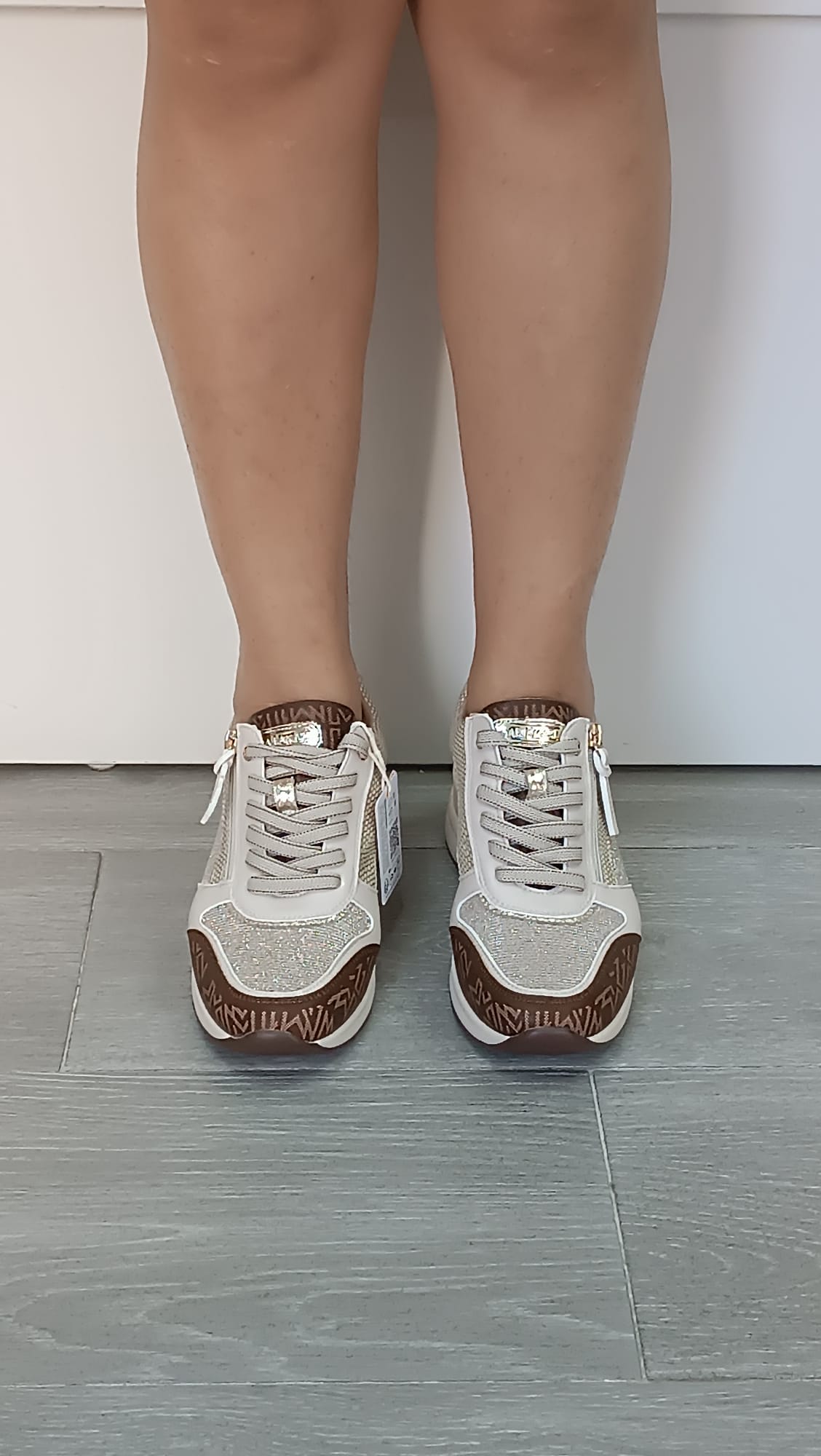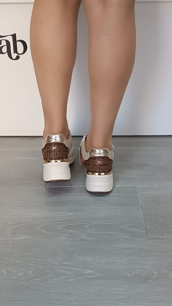 Eleva tu estilo casual con las zapatillas MARIAMARE Lagoa en tonos castaño y arena, un modelo que combina comodidad, elegancia y un toque moderno. Su diseño mezcla materiales brillantes con detalles metalizados y el característico logo de la marca, aportando un look sofisticado y versátil.