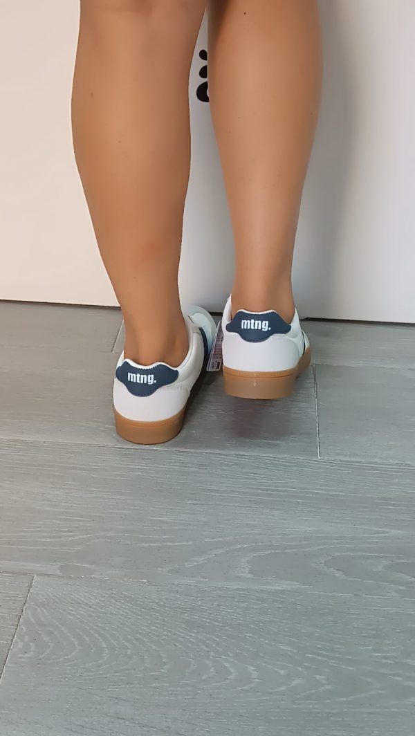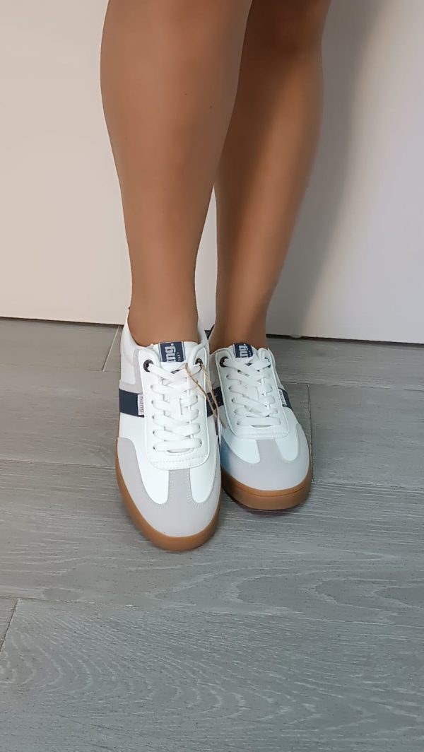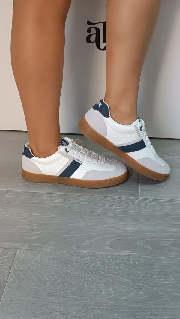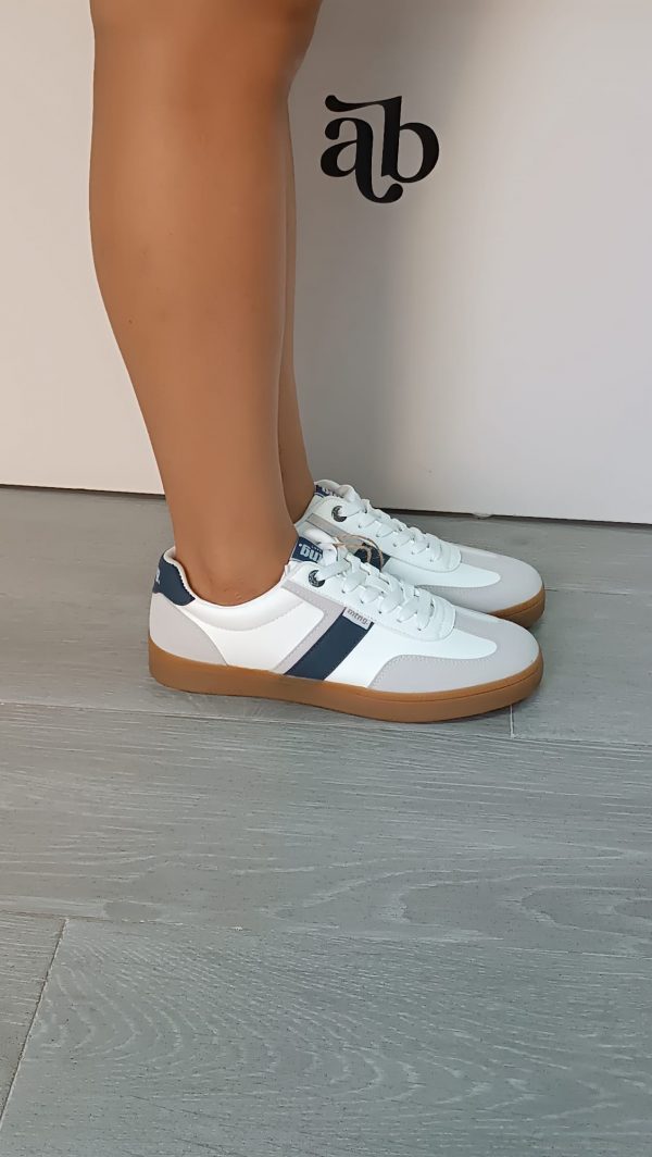 Un clásico atemporal con un toque retro. Estas sneakers en blanco con franjas azul marino y suela caramelo son perfectas para un look urbano y versátil que nunca pasa de moda.